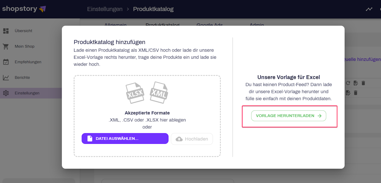 Dazu kann man sich unter "Einstellungen" → "Produktkatalog" → "Quelle hinzufügen" → "Datei hochladen (.xml, .xlsx, .csc)" → "VORLAGE HERUNTERLADEN" das passende File herunterladen.