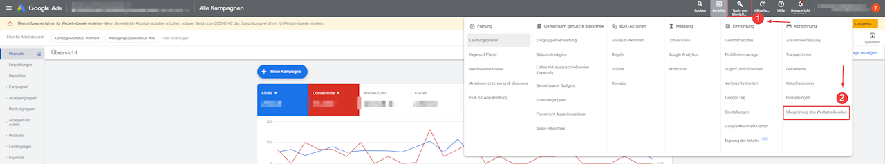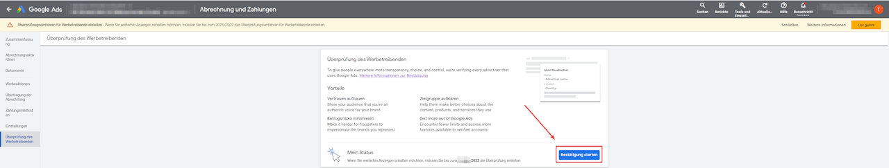 Du kannst direkt zu " Tools und Einstellungen" gehen und unter dem Abschnitt "Abrechnung" auf " Überprüfung des Werbetreibenden" klicken.