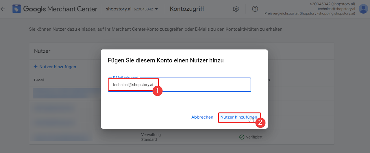 Im nächsten Schritt wirst du gebeten eine Mail Adresse einzugeben. Hier fügst du technical@shopstory.ai hinzu und klickst auf Nutzer hinzufügen.