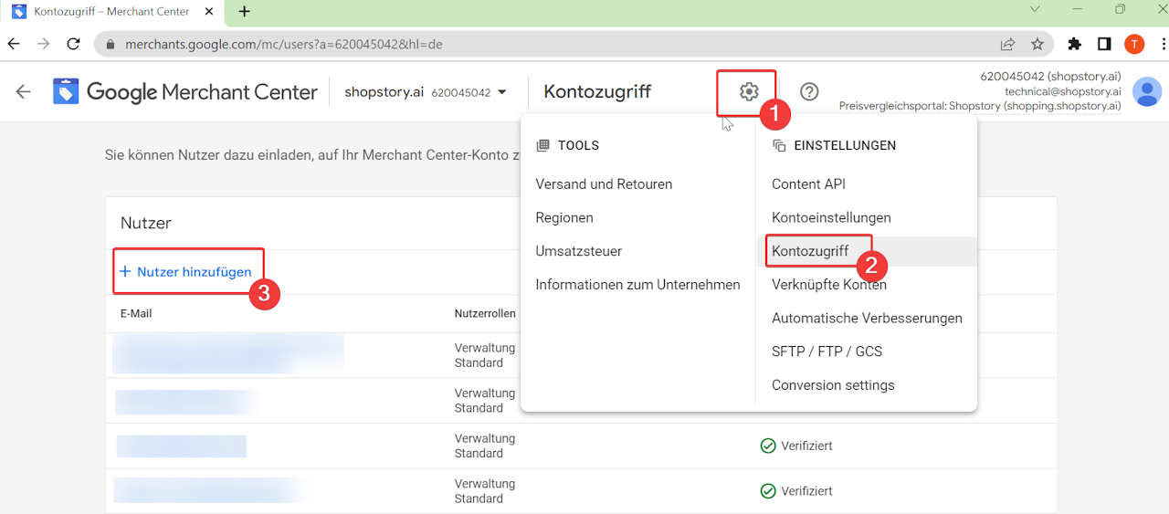 Um einen neuen Nutzer hinzuzufügen logge dich bitte in deinem Merchant Center unter merchants.google.com ein und klicke auf das Zahnrad - Kontozugriff - Nutzer hinzufügen.