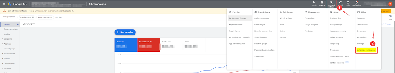 You can directly go to "tools and settings" and click on "Advertiser verification" under the section "billing".