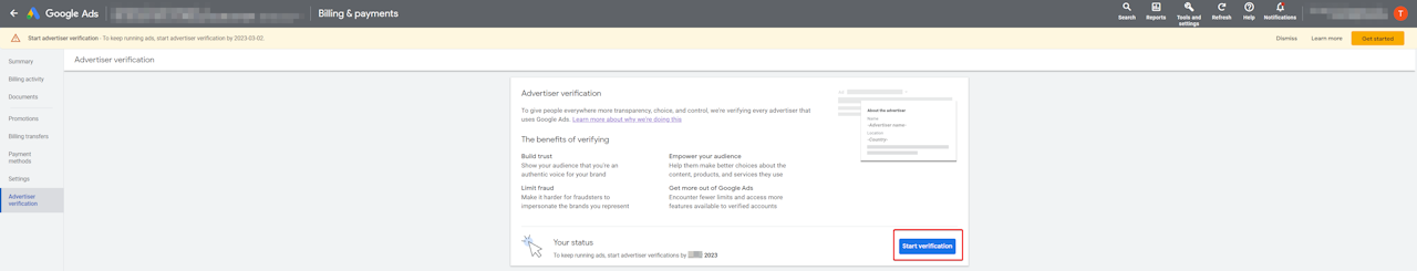 Advertisers will be notified via an email and an in-account notification when they have been selected for the Advertiser verification program.