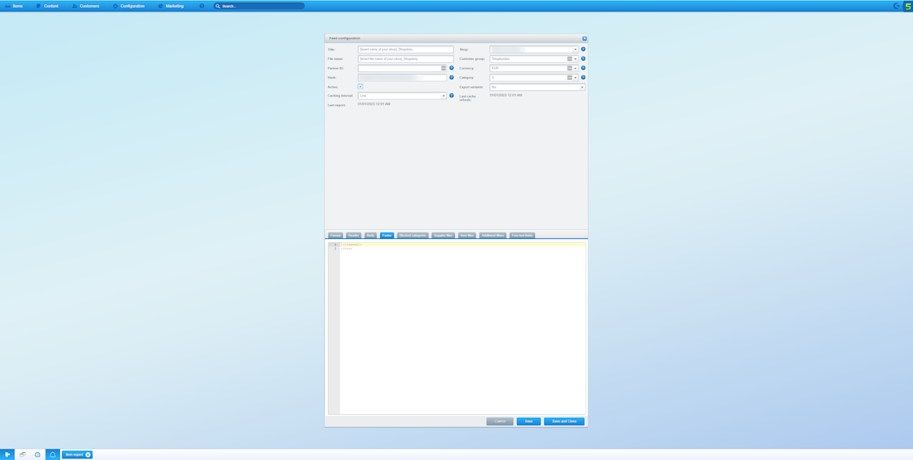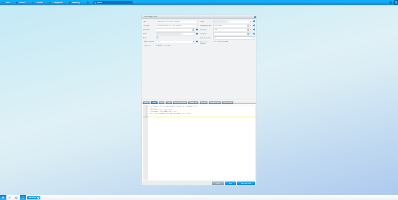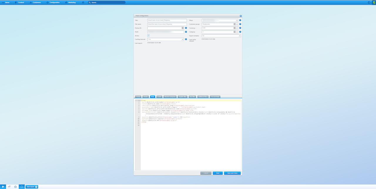 After you have entered your header, switch to the "body" tab and enter the following code:<item> <g:id>{$sArticle.ordernumber|strip|escape}</g:id> <title>{$sArticle.name|strip|escape}</title> <description>{$sArticle.description_long|strip|escape}</description> <g:product_type>{$sArticle.articleID|category:" > "|strip|escape}</g:product_type> <g:link>{$sArticle.articleID|link:$sArticle.name|strip|escape}</g:link> <g:image_link>{$sArticle.image|image:1|strip|escape}</g:image_link> <g:availability>{if $sArticle.esd}in stock{elseif $sArticle.instock>0}in stock{elseif $sArticle.releasedate && $sArticle.releasedate|strtotime > $smarty.now}preorder{else}out of stock{/if}</g:availability> <g:price>{$sArticle.price|strip|escape:"number"} EUR</g:price> <g:brand>{$sArticle.supplier|strip|escape}</g:brand> <g:gtin>{$sArticle.ean|strip|escape}</g:gtin></item>