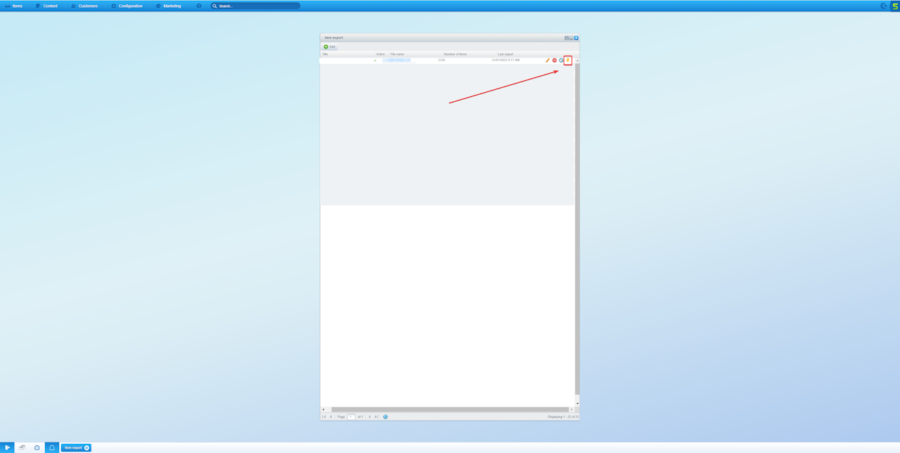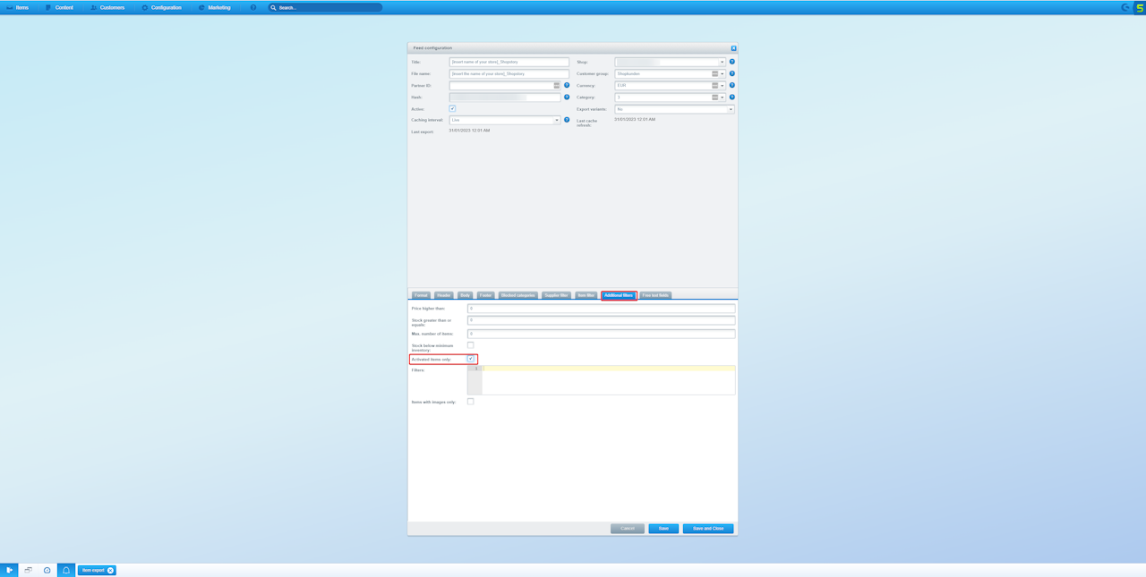Now everything should be ready! Click on the "Save and close" button at the bottom left. To finally start the export and get the URL for the feed, click now in the list of exports on the lightning bolt, at the just created product export.